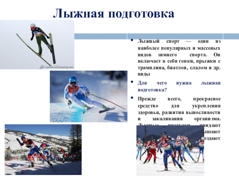 зимнего спорта. Он включает в себя гонки, прыжки с трамплина, биатлон, слалом и др.виды
