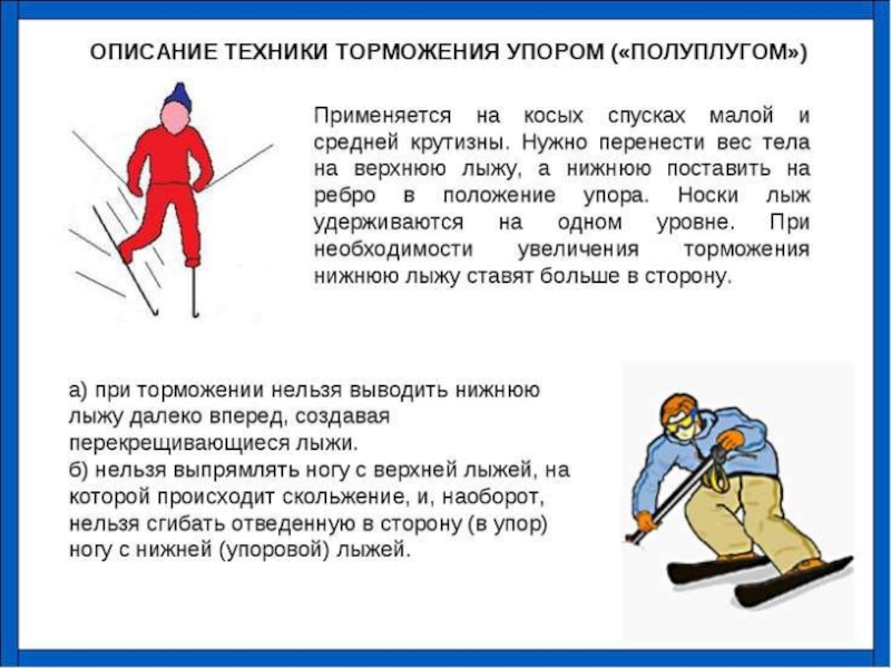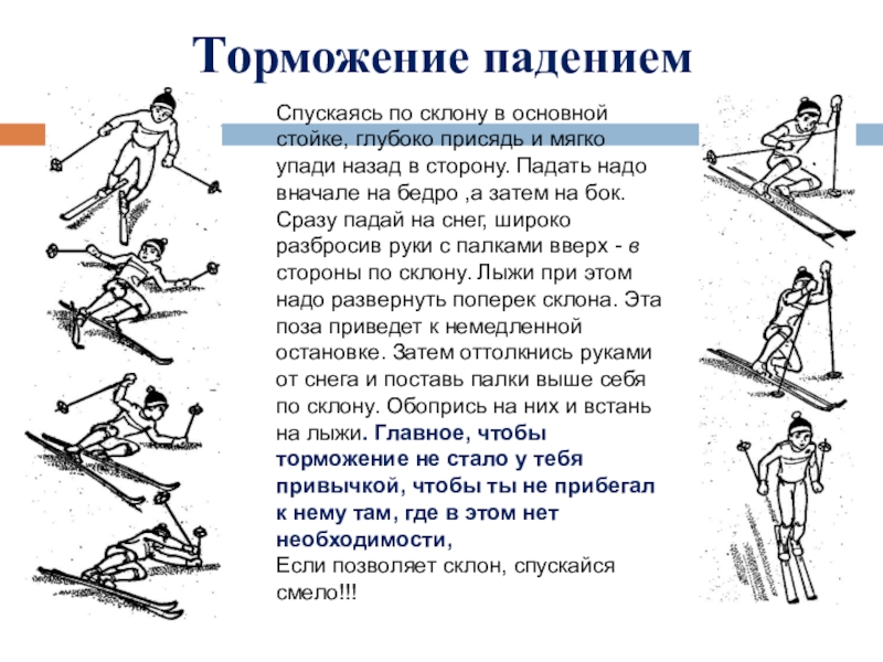 Спускаясь по склону в основной стойке, глубоко присядь и мягко упади назад в сторону. Падать надо вначале на бедро ,а затем на бок. Сразу падай на снег, широко разбросив руки с палками вверх - в стороны по склону. Лыжи при этом надо развернуть поперек склона. Эта поза приведет к немедленной остановке. Затем оттолкнись руками от снега и поставь палки выше себя по склону. Обопрись на них и встань на лыжи. Главное, чтобы торможение не стало у тебя привычкой, чтобы ты не прибегал к нему там, где в этом нет необходимости,
