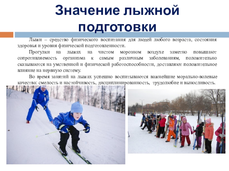 Во время занятий на лыжах успешно воспитываются важнейшие морально-волевые качества: смелость и настойчивость, дисциплинированность, трудолюбие и выносливость.