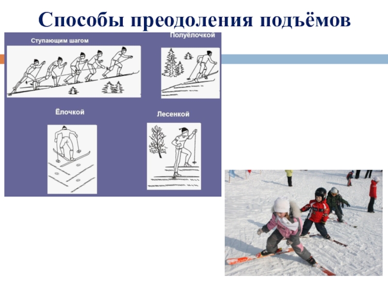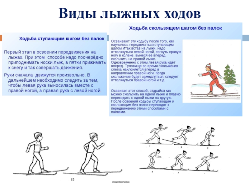 на склоне, так и на ровном участке после выката. Существует два вида поворотов - переступанием с внутренней и с наружной лыжи.