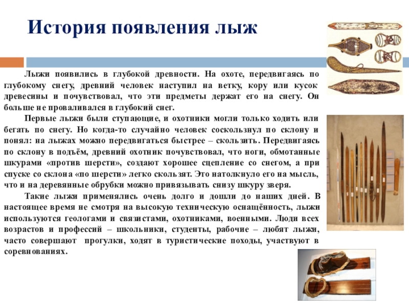 Лыжи появились в глубокой древности. На охоте, передвигаясь по