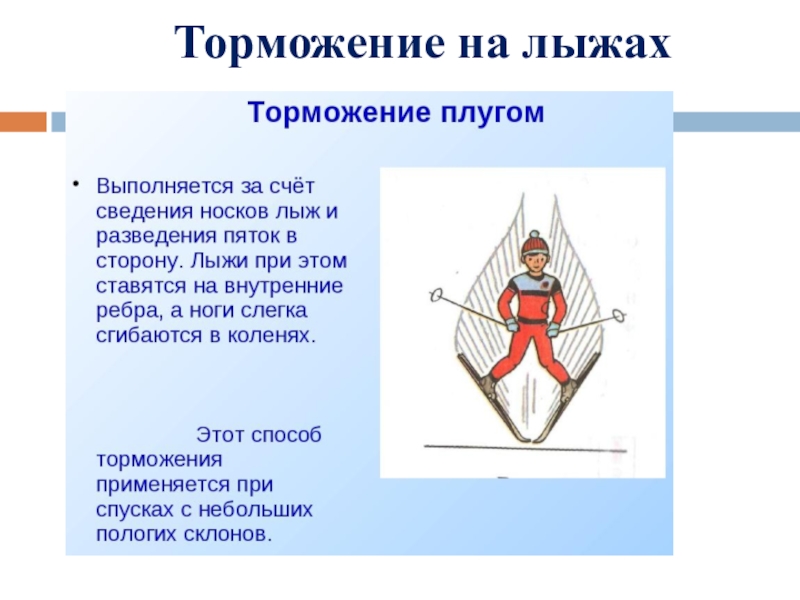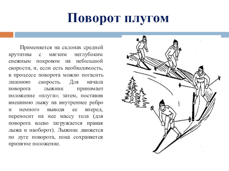 на небольшой скорости, и, если есть необходимость, в процессе поворота можно погасить лишнюю скорость. Для начала поворота лыжник принимает положение «плуга»; затем, поставив внешнюю лыжу на внутреннее ребро и немного выводя ее вперед, переносит на нее массу тела (для поворота влево загружается правая лыжа и наоборот). Лыжник движется по дуге поворота, пока сохраняется принятое положение.