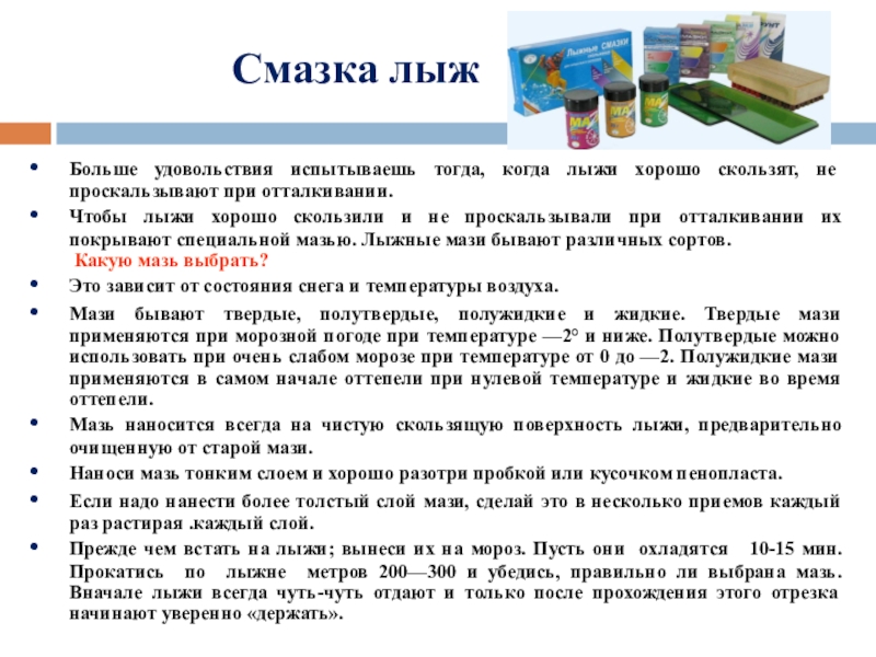 Чтобы лыжи хорошо скользили и не проскальзывали при отталкивании их покрывают специальной мазью. Лыжные мази бывают различных сортов.