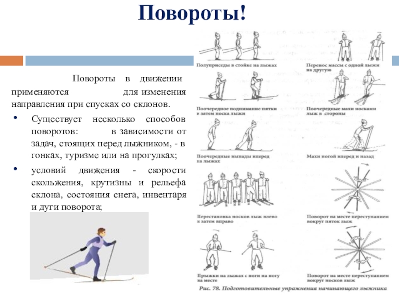 Существует несколько способов поворотов: в зависимости от задач, стоящих перед лыжником, - в гонках, туризме или на прогулках;