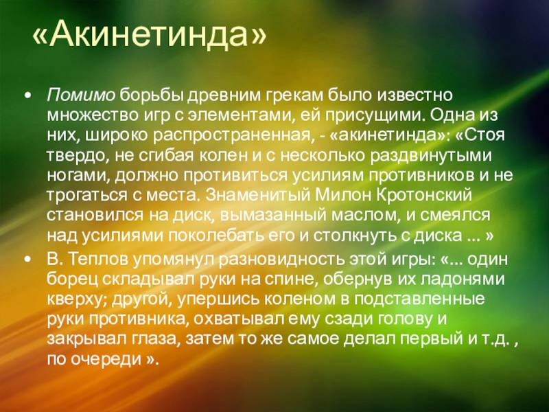 ей присущими. Одна из них, широко распространенная, - «акинетинда»: «Стоя твердо, не сгибая колен и с несколько раздвинутыми ногами, должно противиться усилиям противников и не трогаться с места. Знаменитый Милон Кротонский становился на диск, вымазанный маслом, и смеялся над усилиями поколебать его и столкнуть с диска ... »