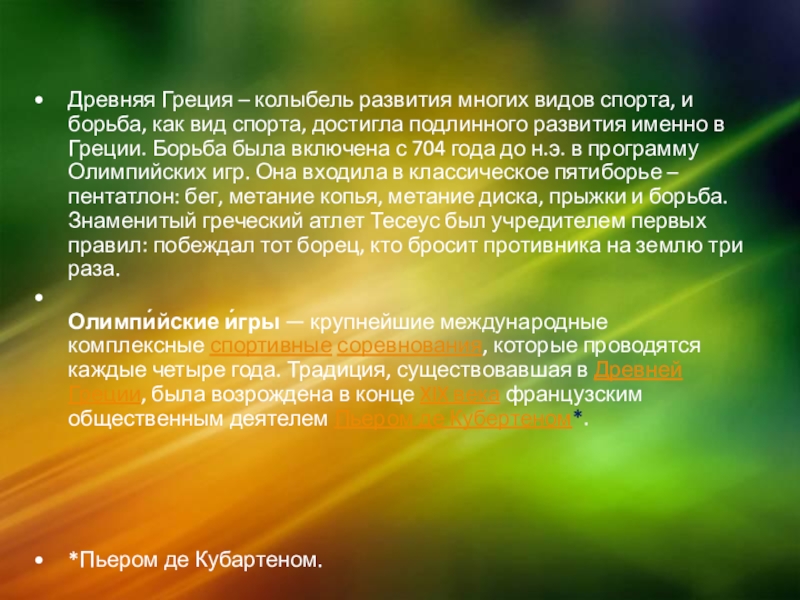 Слайд 2Древняя Греция – колыбель развития многих видов спорта, и борьба, как
