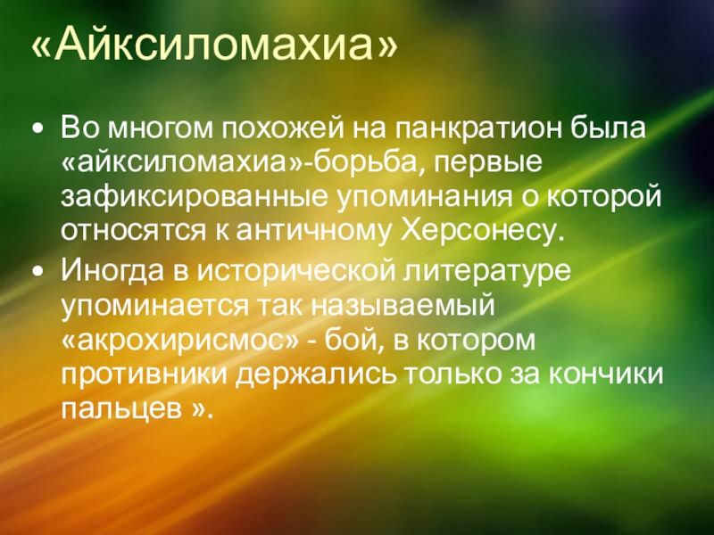 Во многом похожей на панкратион была «айксиломахиа»-борьба, первые зафиксированные упоминания о
