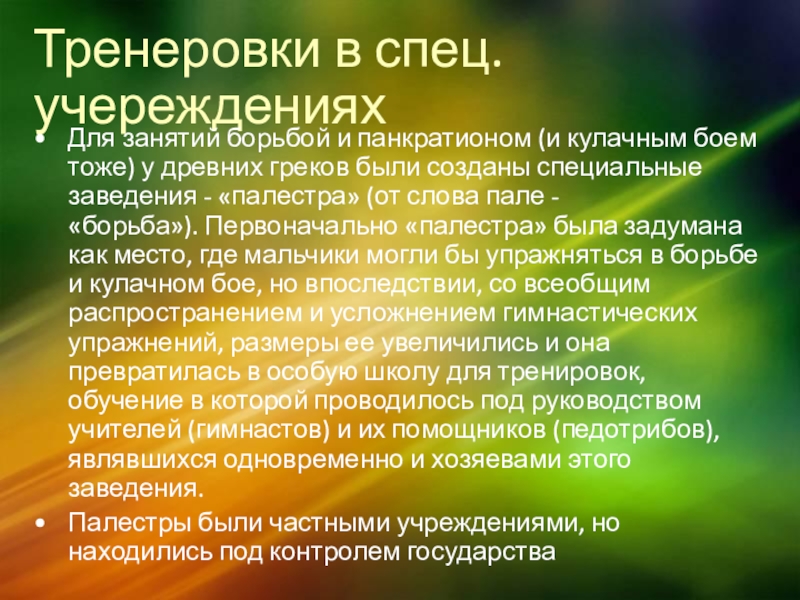 тоже) у древних греков были созданы специальные заведения - «палестра» (от слова пале - «борьба»). Первоначально «палестра» была задумана как место, где мальчики могли бы упражняться в борьбе и кулачном бое, но впоследствии, со всеобщим распространением и усложнением гимнастических упражнений, размеры ее увеличились и она превратилась в особую школу для тренировок, обучение в которой проводилось под руководством учителей (гимнастов) и их помощников (педотрибов), являвшихся одновременно и хозяевами этого заведения.