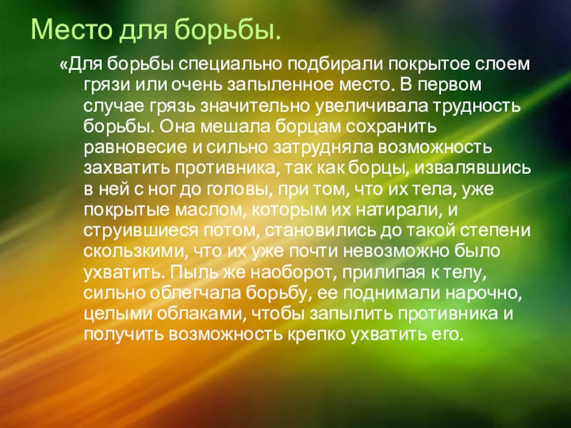 очень запыленное место. В первом случае грязь значительно увеличивала трудность борьбы. Она мешала борцам сохранить равновесие и сильно затрудняла возможность захватить противника, так как борцы, извалявшись в ней с ног до головы, при том, что их тела, уже покрытые маслом, которым их натирали, и струившиеся потом, становились до такой степени скользкими, что их уже почти невозможно было ухватить. Пыль же наоборот, прилипая к телу, сильно облегчала борьбу, ее поднимали нарочно, целыми облаками, чтобы запылить противника и получить возможность крепко ухватить его.