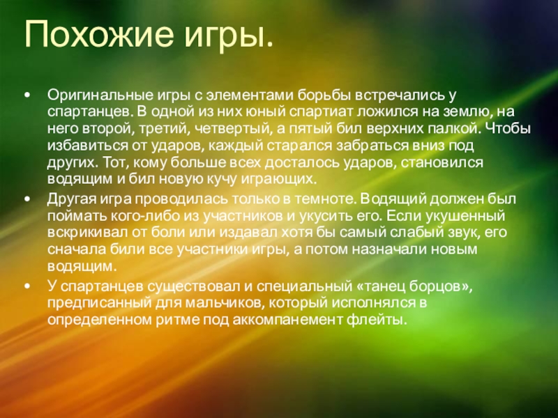 Оригинальные игры с элементами борьбы встречались у спартанцев. В одной из