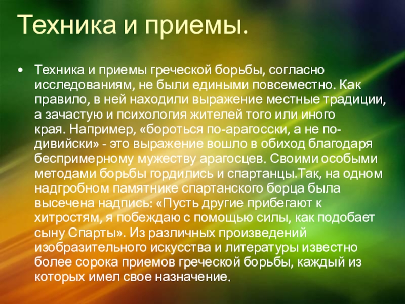 едиными повсеместно. Как правило, в ней находили выражение местные традиции, а зачастую и психология жителей того или иного края. Например, «бороться по-арагосски, а не по-дивийски» - это выражение вошло в обиход благодаря беспримерному мужеству арагосцев. Своими особыми методами борьбы гордились и спартанцы.Так, на одном надгробном памятнике спартанского борца была высечена надпись: «Пусть другие прибегают к хитростям, я побеждаю с помощью силы, как подобает сыну Спарты». Из различных произведений изобразительного искусства и литературы известно более сорока приемов греческой борьбы, каждый из которых имел свое назначение.