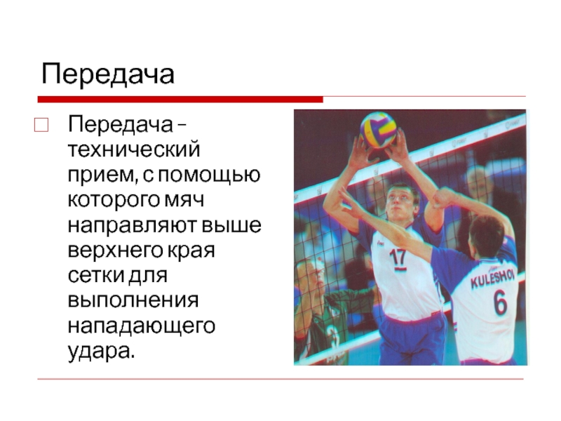 Передача – технический прием, с помощью которого мяч направляют выше верхнего