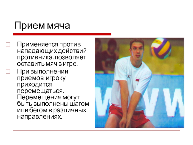 Технический прием применяется при приеме подач противника, нападающих ударов, при