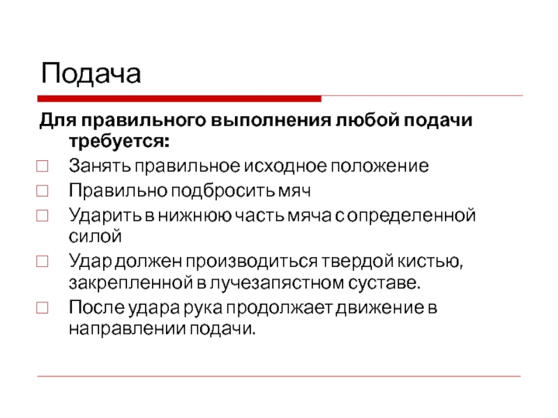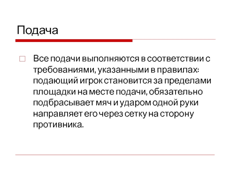 Подача – технический прием, с помощью которого мяч вводят в игру.
