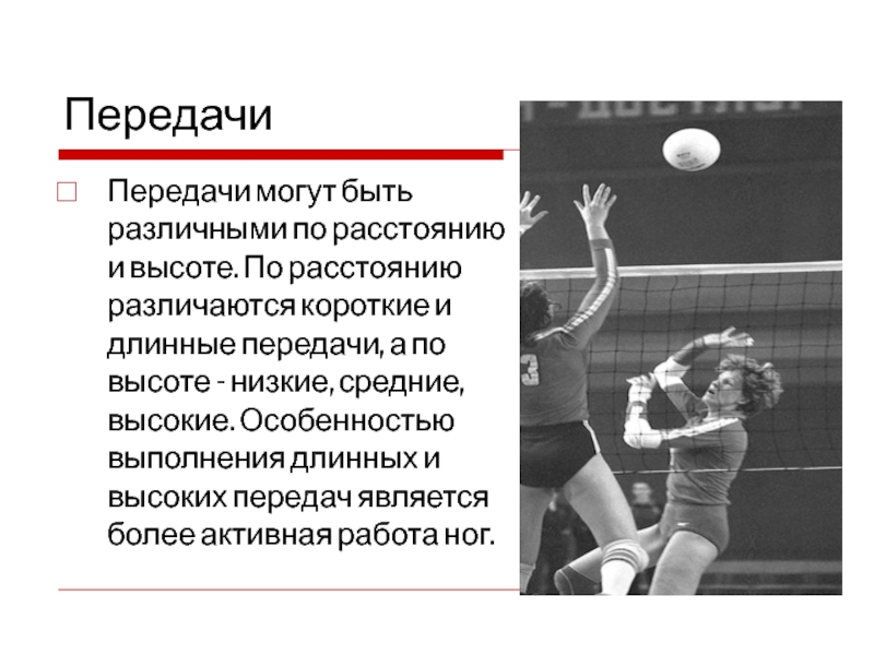 короткие и длинные передачи, а по высоте - низкие, средние, высокие. Особенностью выполнения длинных и высоких передач является более активная работа ног.