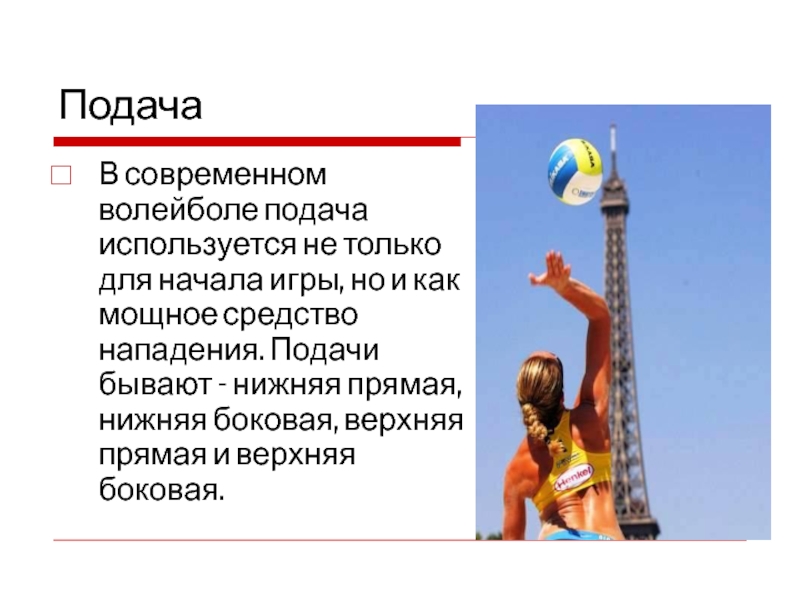и как мощное средство нападения. Подачи бывают - нижняя прямая, нижняя боковая, верхняя прямая и верхняя боковая.