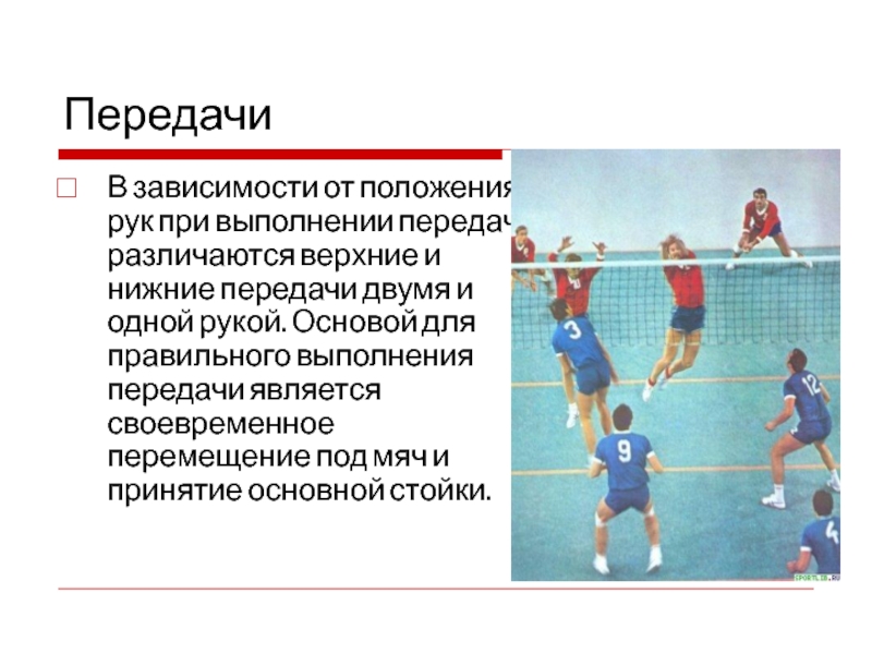 нижние передачи двумя и одной рукой. Основой для правильного выполнения передачи является своевременное перемещение под мяч и принятие основной стойки.