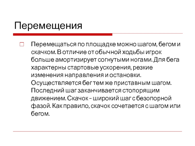 обычной ходьбы игрок больше амортизирует согнутыми ногами. Для бега характерны стартовые ускорения, резкие изменения направления и остановки. Осуществляется бег тем же приставным шагом. Последний шаг заканчивается стопорящим движением. Скачок – широкий шаг с безопорной фазой. Как правило, скачок сочетается с шагом или бегом.
