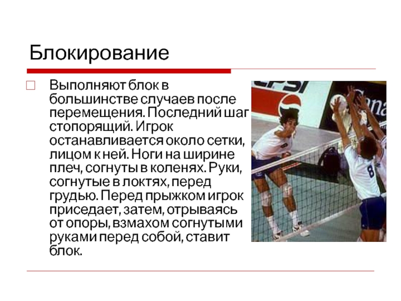 к мячу, летящему после нападающего удара противника. В блоке могут участвовать один, два и три игрока передней линии.