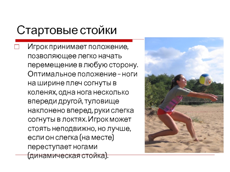 Оптимальное положение – ноги на ширине плеч согнуты в коленях, одна нога несколько впереди другой, туловище наклонено вперед, руки слегка согнуты в локтях. Игрок может стоять неподвижно, но лучше, если он слегка (на месте) переступает ногами (динамическая стойка).