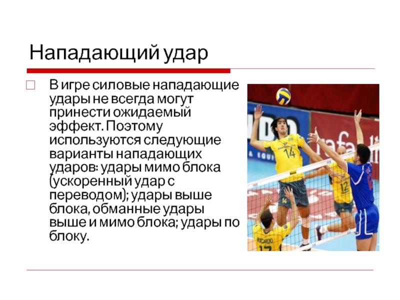 Технические приемы атакующих действий заключается в том, что игрок перебивает