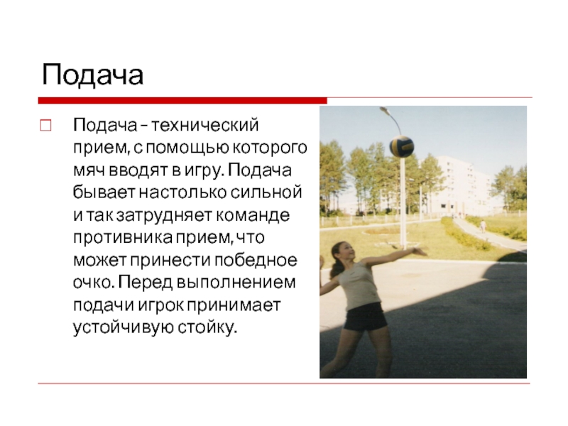 Подача бывает настолько сильной и так затрудняет команде противника прием, что может принести победное очко. Перед выполнением подачи игрок принимает устойчивую стойку.