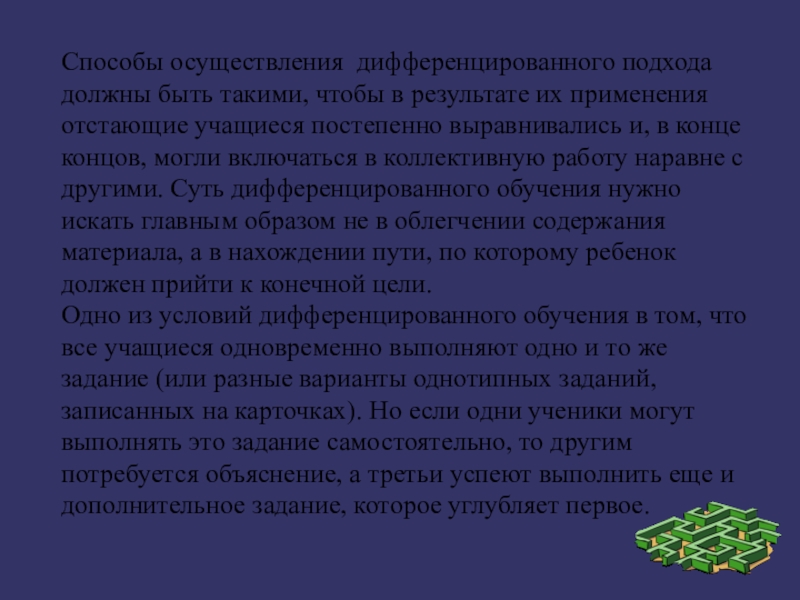 применения отстающие учащиеся постепенно выравнивались и, в конце концов, могли включаться в коллективную работу наравне с другими. Суть дифференцированного обучения нужно искать главным образом не в облегчении содержания материала, а в нахождении пути, по которому ребенок должен прийти к конечной цели.