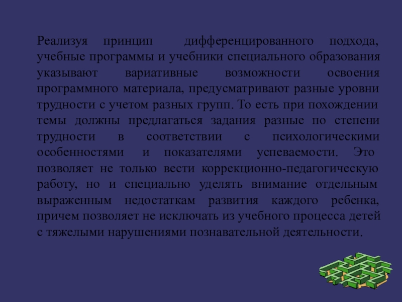 Слайд 11Реализуя принцип дифференцированного подхода, учебные программы и учебники специального образования указывают