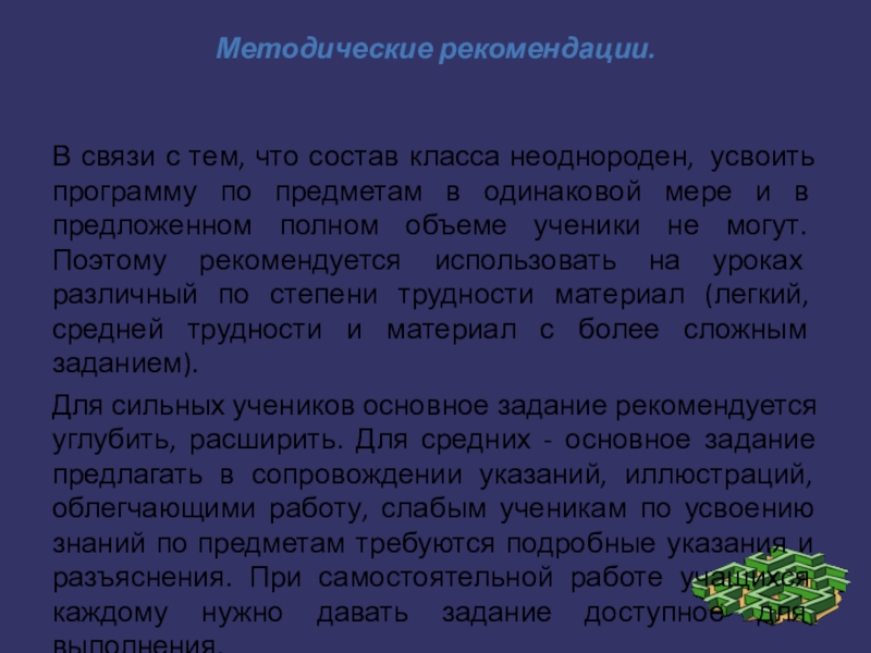Для сильных учеников основное задание рекомендуется углубить, расширить. Для средних - основное задание предлагать в сопровождении указаний, иллюстраций, облегчающими работу, слабым ученикам по усвоению знаний по предметам требуются подробные указания и разъяснения. При самостоятельной работе учащихся каждому нужно давать задание доступное для выполнения.