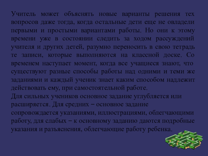 Учитель может объяснять новые варианты решения даже тогда, когда остальные дети еще не овладели самыми простыми вариантами работы.