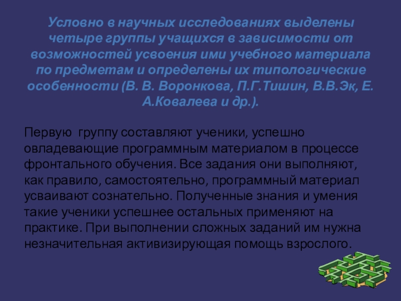 Слайд 7Условно в научных исследованиях выделены четыре группы учащихся в зависимости от
