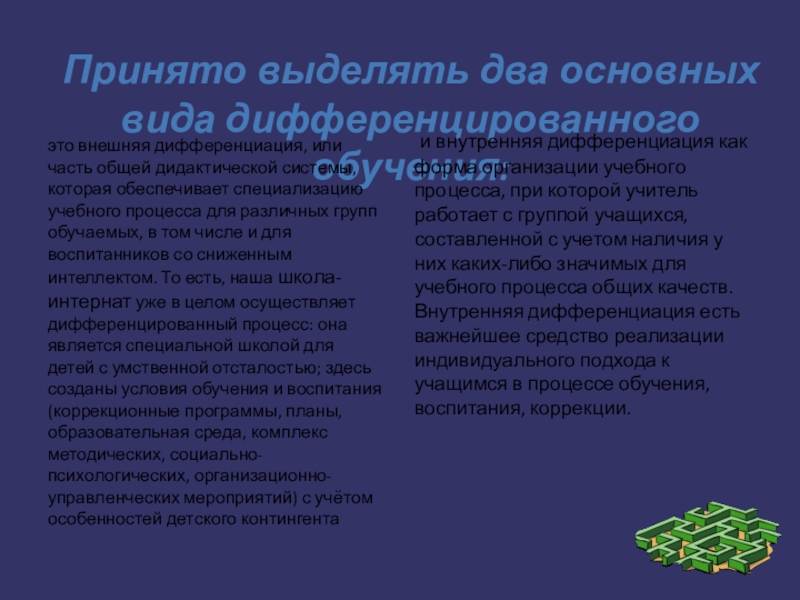 общей дидактической системы, которая обеспечивает специализацию учебного процесса для различных групп обучаемых, в том числе и для воспитанников со сниженным интеллектом. То есть, наша школа-интернат уже в целом осуществляет дифференцированный процесс: она является специальной школой для детей с умственной отсталостью; здесь созданы условия обучения и воспитания (коррекционные программы, планы, образовательная среда, комплекс методических, социально- психологических, организационно-управленческих мероприятий) с учётом особенностей детского контингента