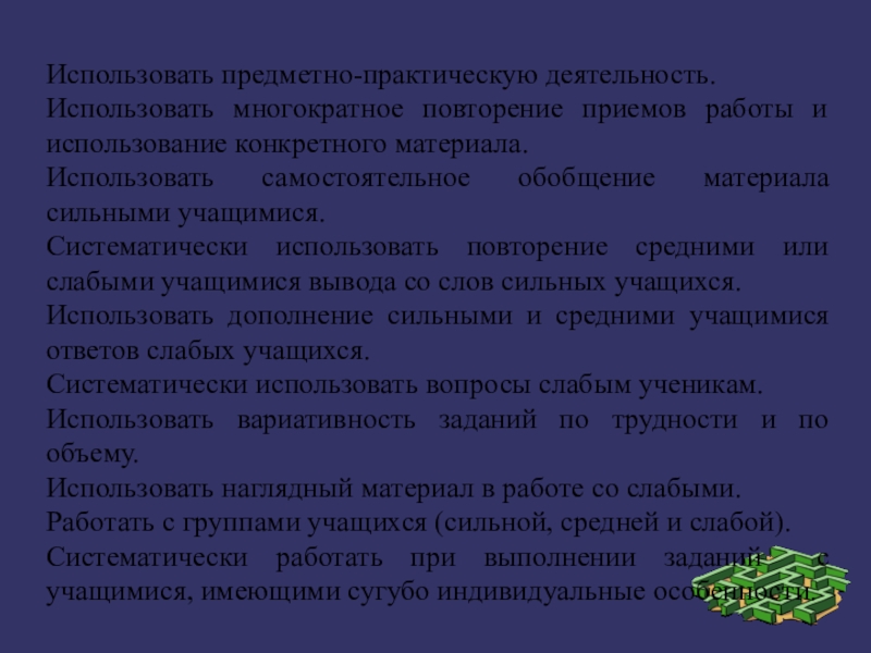 Систематически работать при выполнении заданий с учащимися, имеющими сугубо индивидуальные особенности.