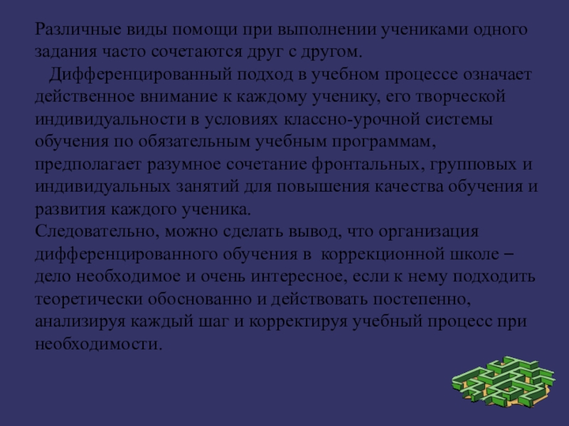 Следовательно, можно сделать вывод, что организация дифференцированного обучения в коррекционной школе – дело необходимое и очень интересное, если к нему подходить теоретически обоснованно и действовать постепенно, анализируя каждый шаг и корректируя учебный процесс при необходимости.