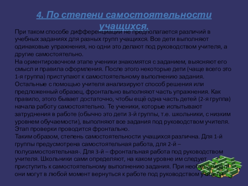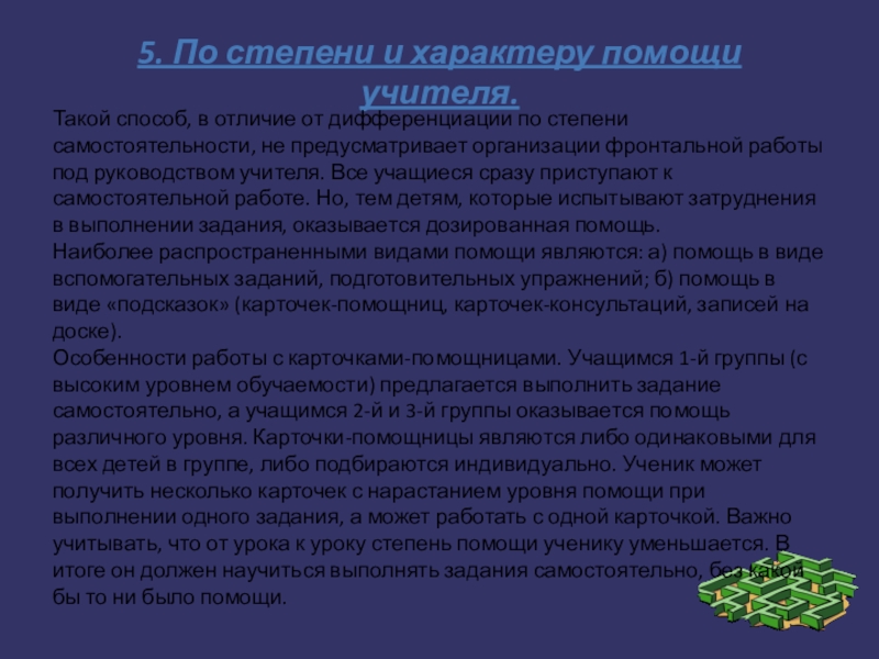 дифференциации по степени самостоятельности, не предусматривает организации фронтальной работы под руководством учителя. Все учащиеся сразу приступают к самостоятельной работе. Но, тем детям, которые испытывают затруднения в выполнении задания, оказывается дозированная помощь.