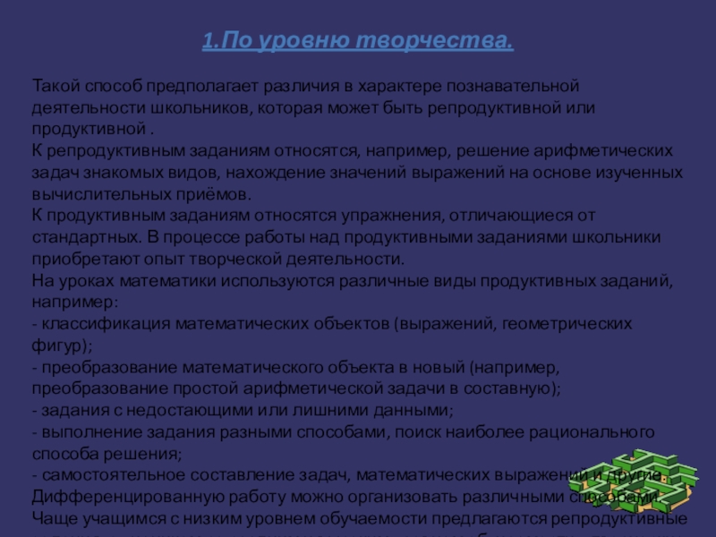 Дифференцированную работу можно организовать различными способами. Чаще учащимся с низким уровнем обучаемости предлагаются репродуктивные задания, а ученикам со средним и высоким уровнем обучаемости – творческие задания.