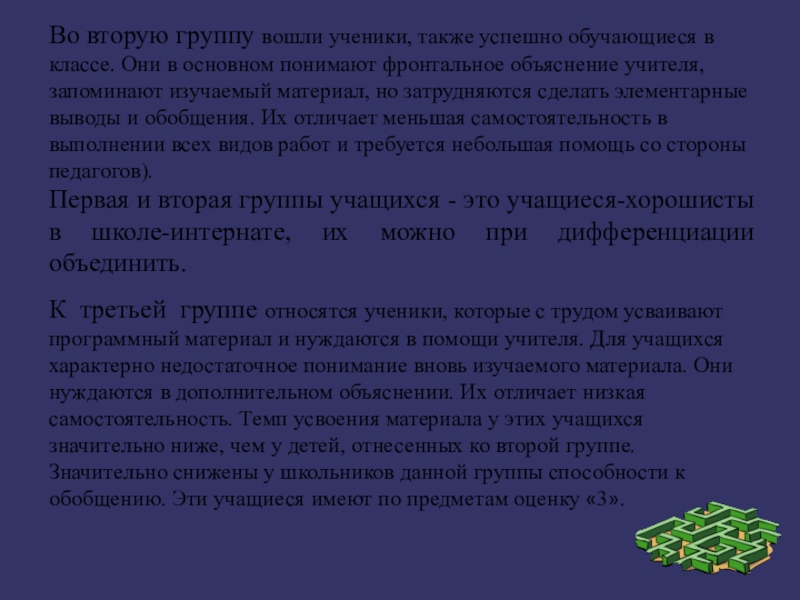 Первая и вторая группы учащихся - это учащиеся-хорошисты в школе-интернате, их можно при дифференциации объединить.