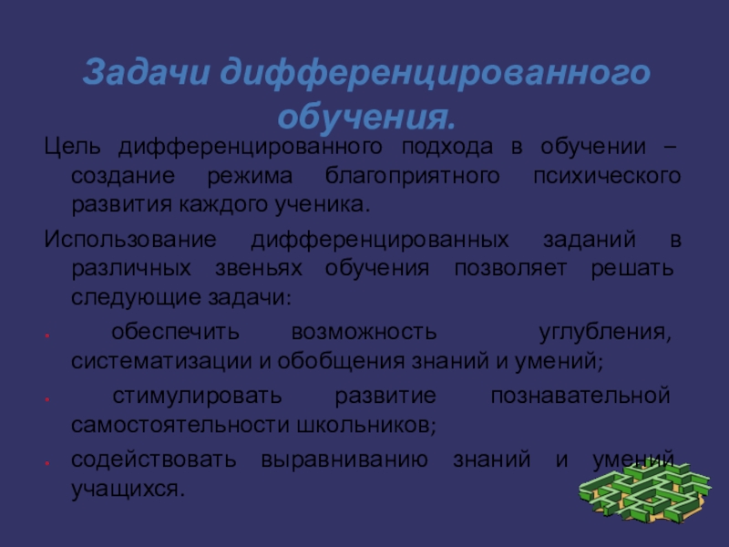 Использование дифференцированных заданий в различных звеньях обучения позволяет решать следующие задачи: