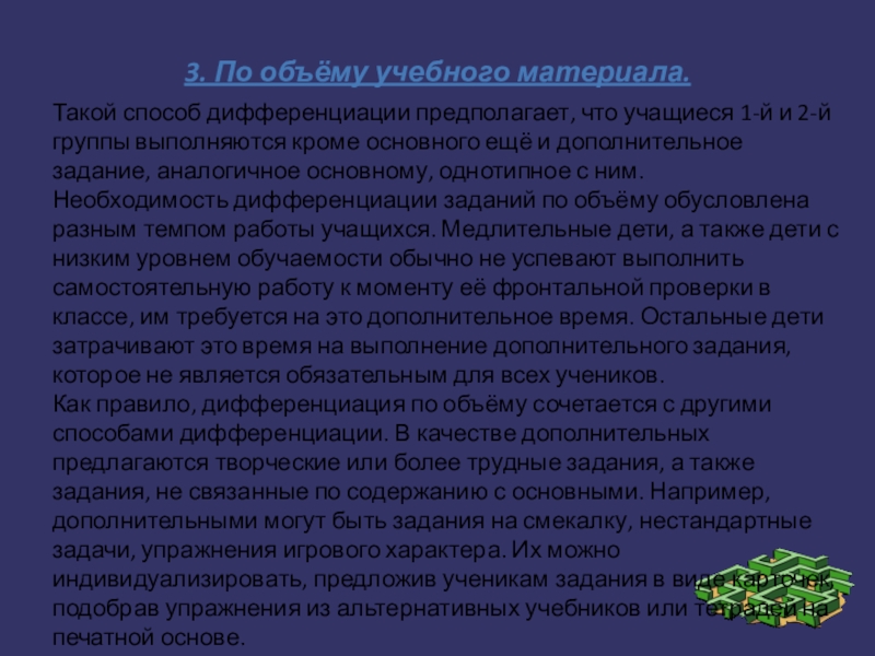 Необходимость дифференциации заданий по объёму обусловлена разным темпом работы учащихся. Медлительные дети, а также дети с низким уровнем обучаемости обычно не успевают выполнить самостоятельную работу к моменту её фронтальной проверки в классе, им требуется на это дополнительное время. Остальные дети затрачивают это время на выполнение дополнительного задания, которое не является обязательным для всех учеников.