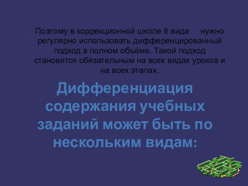 школе 8 вида нужно регулярно использовать дифференцированный подход в полном объёме. Такой подход становится обязательным на всех видах уроков и на всех этапах.