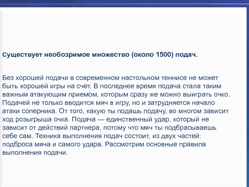 настольном теннисе не может быть хорошей игры на счет. В последнее время подача стала таким важным атакующим приемом, которым сразу же можно выиграть очко. Подачей не только вводится мяч в игру, но и затрудняется начало атаки соперника. От того, какую ты подашь подачу, во многом зависит ход розыгрыша очка. Подача — единственный удар, который не зависит от действий партнера, потому что мяч ты подбрасываешь себе сам. Техника выполнения подач состоит, из двух частей: подброса мяча и самого удара. Рассмотрим основные правила выполнения подачи.
