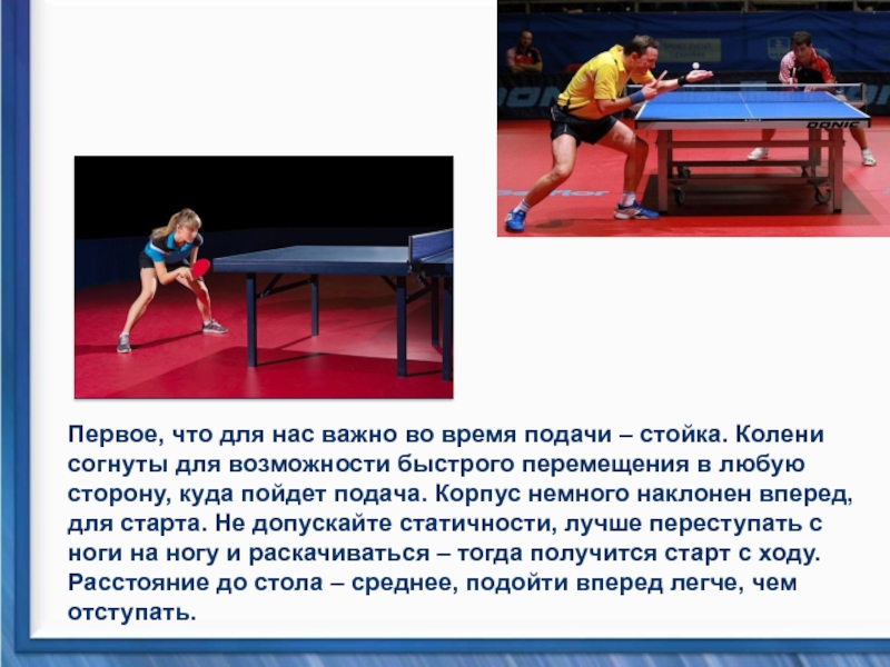согнуты для возможности быстрого перемещения в любую сторону, куда пойдет подача. Корпус немного наклонен вперед, для старта. Не допускайте статичности, лучше переступать с ноги на ногу и раскачиваться – тогда получится старт с ходу. Расстояние до стола – среднее, подойти вперед легче, чем отступать.