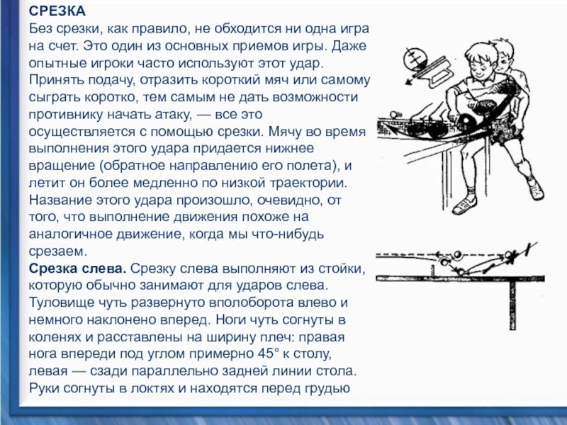счет. Это один из основных приемов игры. Даже опытные игроки часто используют этот удар. Принять подачу, отразить короткий мяч или самому сыграть коротко, тем самым не дать возможности противнику начать атаку, — все это осуществляется с помощью срезки. Мячу во время выполнения этого удара придается нижнее вращение (обратное направлению его полета), и летит он более медленно по низкой траектории. Название этого удара произошло, очевидно, от того, что выполнение движения похоже на аналогичное движение, когда мы что-нибудь срезаем.