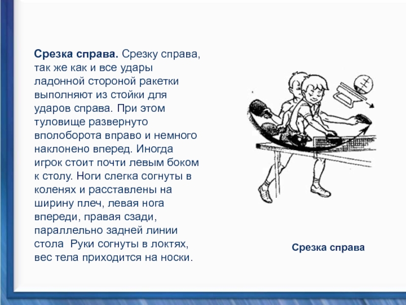 Срезка слева. Срезку слева выполняют из стойки, которую обычно занимают для ударов слева. Туловище чуть развернуто вполоборота влево и немного наклонено вперед. Ноги чуть согнуты в коленях и расставлены на ширину плеч: правая нога впереди под углом примерно 45° к столу, левая — сзади параллельно задней линии стола. Руки согнуты в локтях и находятся перед грудью