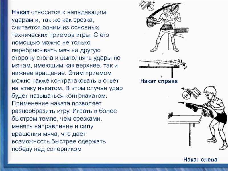 одним из основных технических приемов игры. С его помощью можно не только перебрасывать мяч на другую сторону стола и выполнять удары по мячам, имеющим как верхнее, так и нижнее вращение. Этим приемом можно также контратаковать в ответ на атаку накатом. В этом случае удар будет называться контрнакатом.