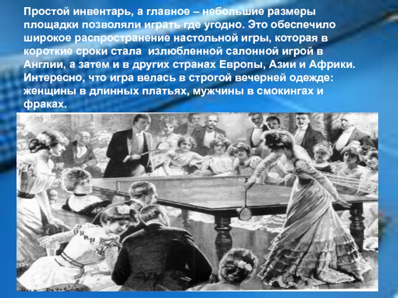 угодно. Это обеспечило широкое распространение настольной игры, которая в короткие сроки стала излюбленной салонной игрой в Англии, а затем и в других странах Европы, Азии и Африки. Интересно, что игра велась в строгой вечерней одежде: женщины в длинных платьях, мужчины в смокингах и фраках.
