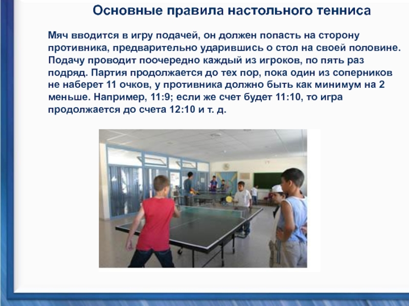 на сторону противника, предварительно ударившись о стол на своей половине. Подачу проводит поочередно каждый из игроков, по пять раз подряд. Партия продолжается до тех пор, пока один из соперников не наберет 11 очков, у противника должно быть как минимум на 2 меньше. Например, 11:9; если же счет будет 11:10, то игра продолжается до счета 12:10 и т. д.