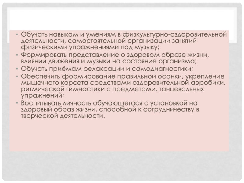 Обеспечить формирование правильной осанки, укрепление мышечного корсета средствами оздоровительной аэробики, ритмической гимнастики с предметами, танцевальных упражнений;