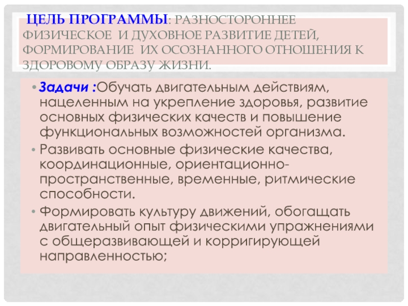 Слайд 3 Цель программы: разностороннее физическое и духовное развитие детей, формирование их