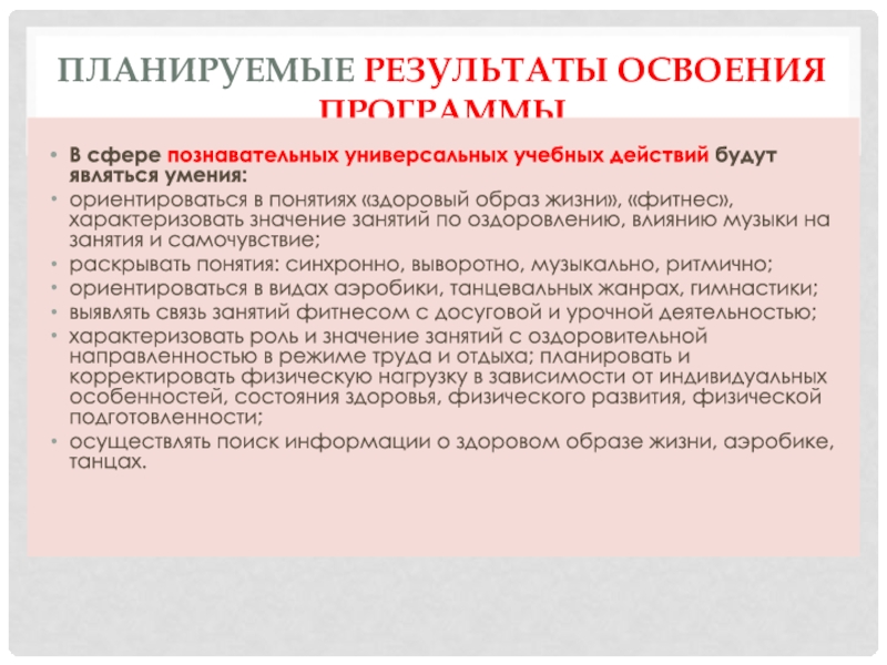 Она расширяет спектр знаний, умений и навыков, полученных в урочное время и тесно связана с ними, благодаря направленности на изучение и совершенствование особенностей своего организма, разучивание комплексов упражнений оздоровительного направления, связь с музыкой, благотворно влияющей на эмоциональное здоровье.